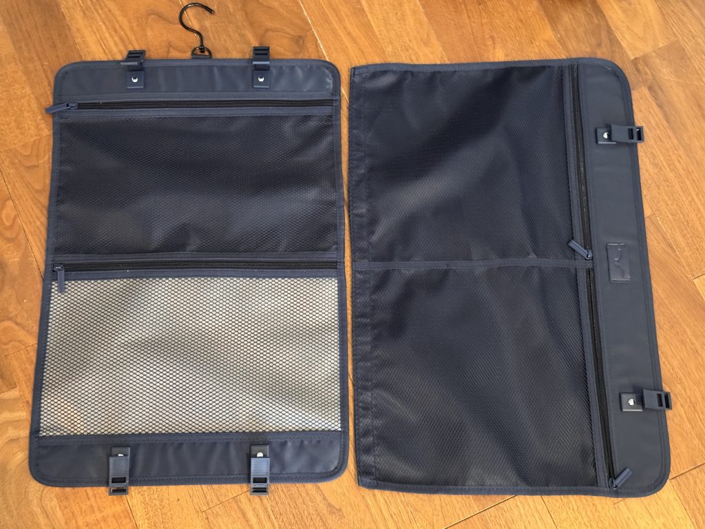 特に、写真左側の仕切りは、ポケットが縦向きで、なんとハンガーフック付き。